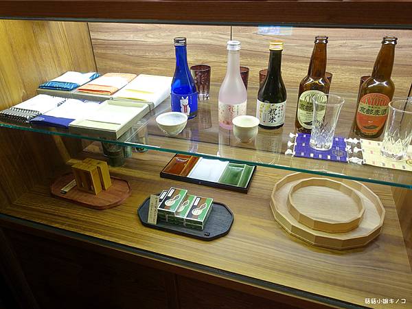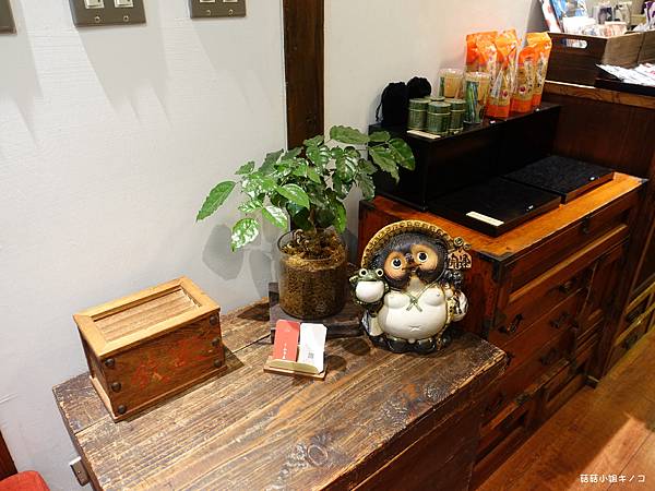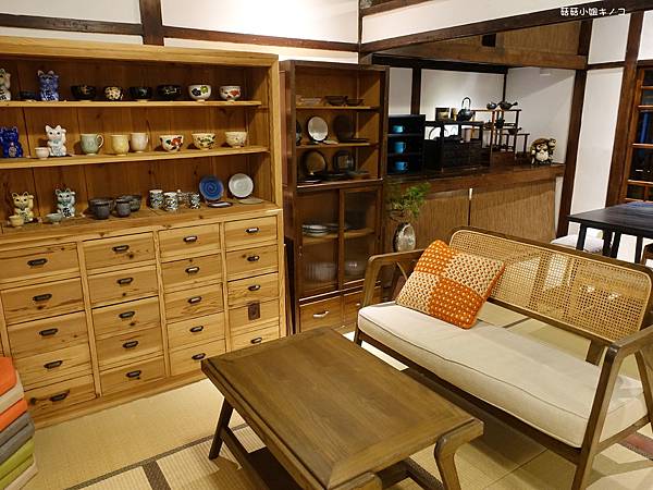 一旁架上放了很多質感的杯盤和招財貓